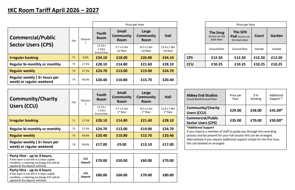 Discounts available for charity and community users, see full tariff sheet below.