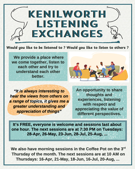 The Listening Exchanges sessions have been running for over three years and we have lots of feedback from Kenilworth residents including: