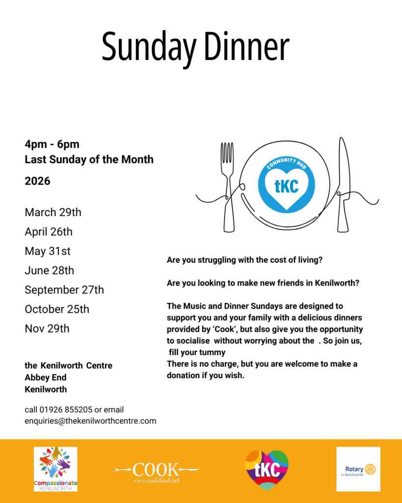Music & Dinner Sundays have been created in partnership with Compassionate Kenilworth, a cost of living event supported by Warwick District Council Cost of Living and councillors grant.